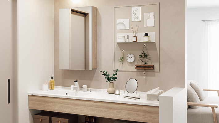 忙しい朝でも、しっかり身支度したい女性にこそ使ってほしいのが、シーライン。ツインラインLED搭載のミラーが顔全体をムラなく照らしてメイクやスキンケアを快適にサポート。さらにカウンター幅は750~1700mmから選べ、最長1700mmならゆったり座ってメイクやケアができる広々スペースを確保できます。