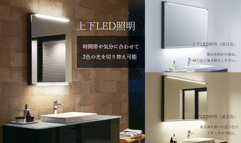 また、照明が目に直接当たりにくいアッパー&アンダーの配置なので、夜間や早朝の薄暗い脱衣所でも目に優しく、まぶしさを感じさせません。