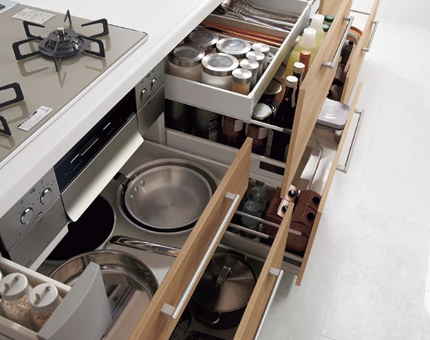 ミッテの収納には「センターラインキャビネット」を採用。キャビネットを上下2段に分割し、よく使うものは取り出しやすい上段へ、大きめの調理器具やストック品は下段へ。調味料ボトルの高さがバラバラでもすっきり整理でき、使いたいアイテムがすぐ手に取れるのが魅力です。