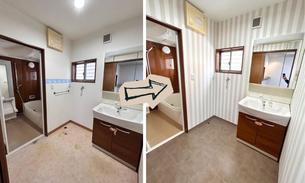 Before:キズやへこみ、色あせが目立つ洗面脱衣所