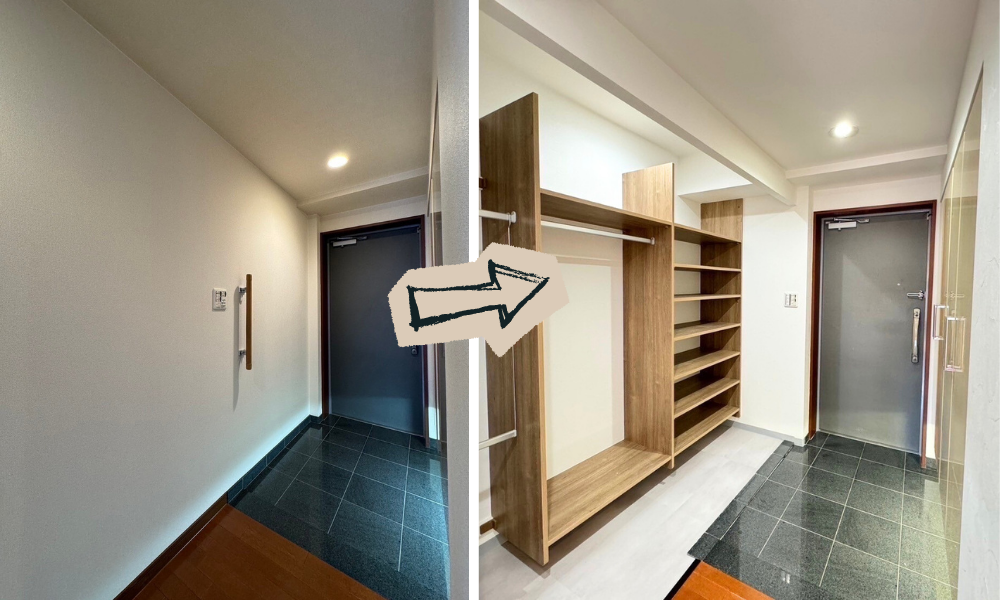 - 既存の収納を撤去し、大容量の大型シューズボックスに交換。