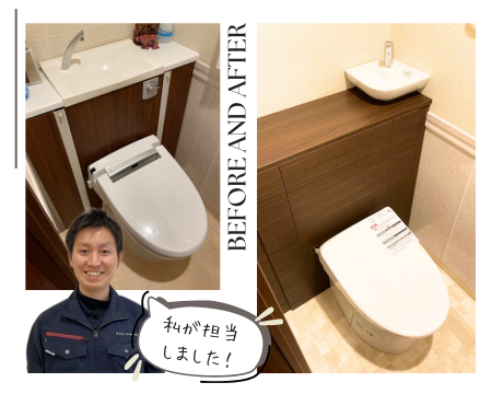 もともとキャビネット付きのトイレをお使いでしたが、今回のリフォームで「レストパル」に一新!収納力は変わらずしっかり確保しながら、デザイン性が高く、空間全体がよりスッキリとした印象😎