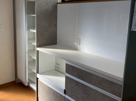 今回のキッチンでは、背面に大きな収納キャビネットも設置しました✨