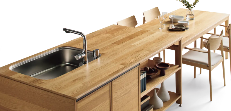 次にご紹介したいのは、見た瞬間に「いいなぁ〜」と声が出た【天然木ワークトップ】。