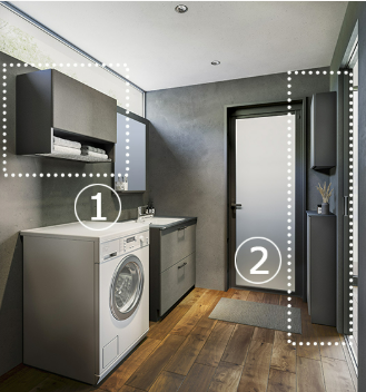 そして「Noare」は、間取りを変えずに便利な暮らしを実現できるアイテムも豊富💡コンパクトキャビネット①やフラップウォール②など、限られたスペースを最大限に活用できる工夫が詰まっていますよ🎵