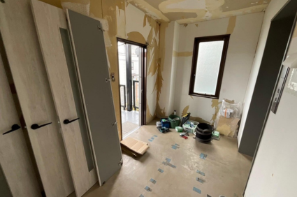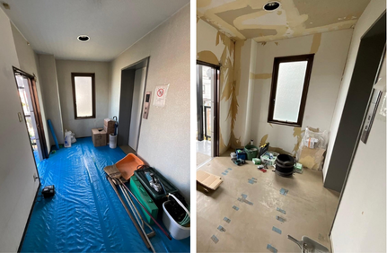 壁紙は張替られていて、パッと明るくなりましたね🥰床材が完成するとどうなるか、ドキドキ、ワクワク😎✨