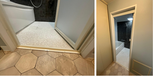浴室の入口部分にはフラットな出入り口を採用し、ドア枠も段差が少ないタイプに変更🛁
