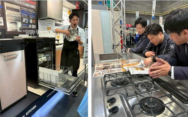 キッチンではフロントオープン食器洗い乾燥機の実演をされていたり、ガスコンロの魅力的な商品をお勉強✏