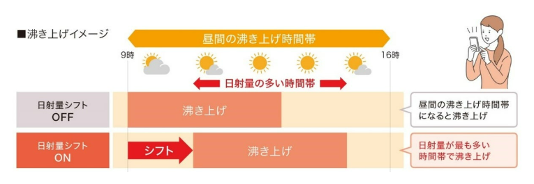 専用アプリ「スマホでおふろ」と連携すると、翌日の天気(日射量)をチェックして、発電が多い時間帯に合わせてお湯を沸かすことが可能🙌✨