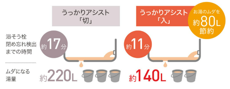 - 浴槽の栓を閉め忘れたら、すぐにお知らせしてくれる「うっかりアシスト」機能