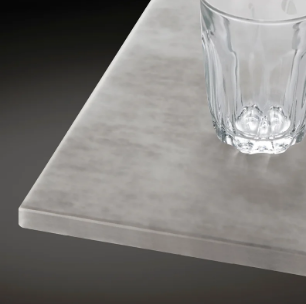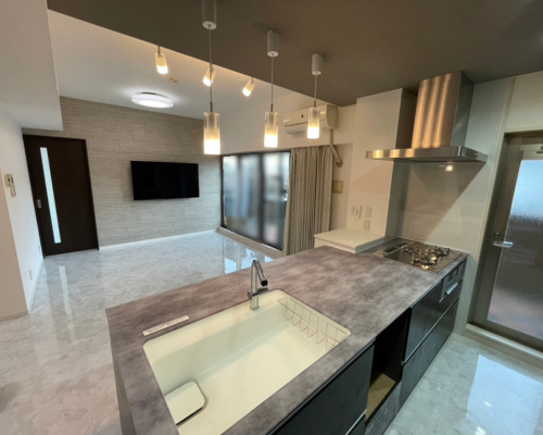やわらかい表情のあるワークトップで、ダーク系の扉カラーとのコントラストが美しく映えます。