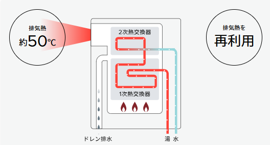 排熱を再利用して効率よくお湯をつくる方式で、従来型よりガス使用量を抑えられます🙌✨