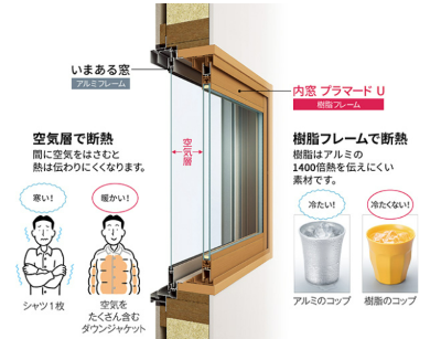 既存の窓の内側にもう一つ窓を設置することで、窓と窓の間に空気層ができ、断熱性能が高まります。