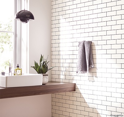 防水性・防カビ性のある壁紙を選びつつ、小柄で明るいデザインで狭い空間を広く見せる効果も🙌