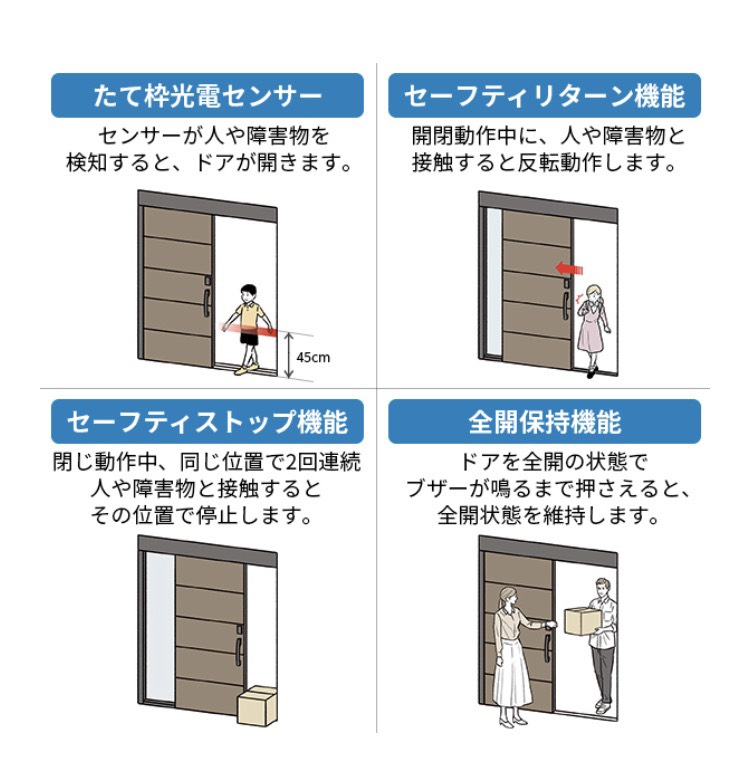 - 自動開閉中に障害物に当たると反転して開く「セーフティリターン機能」