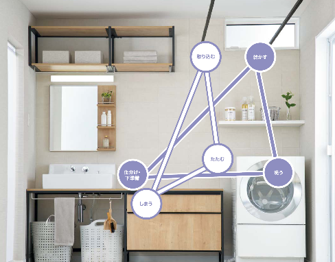 特に注目したいのが「ダブルトライアングル動線」✨ 洗濯の「洗う」「干す」「収納する」の動線と、「アイロンがけ」「たたむ」「しまう」の動線が三角形に配置されることで、移動が最小限に抑えられるんです😲✨