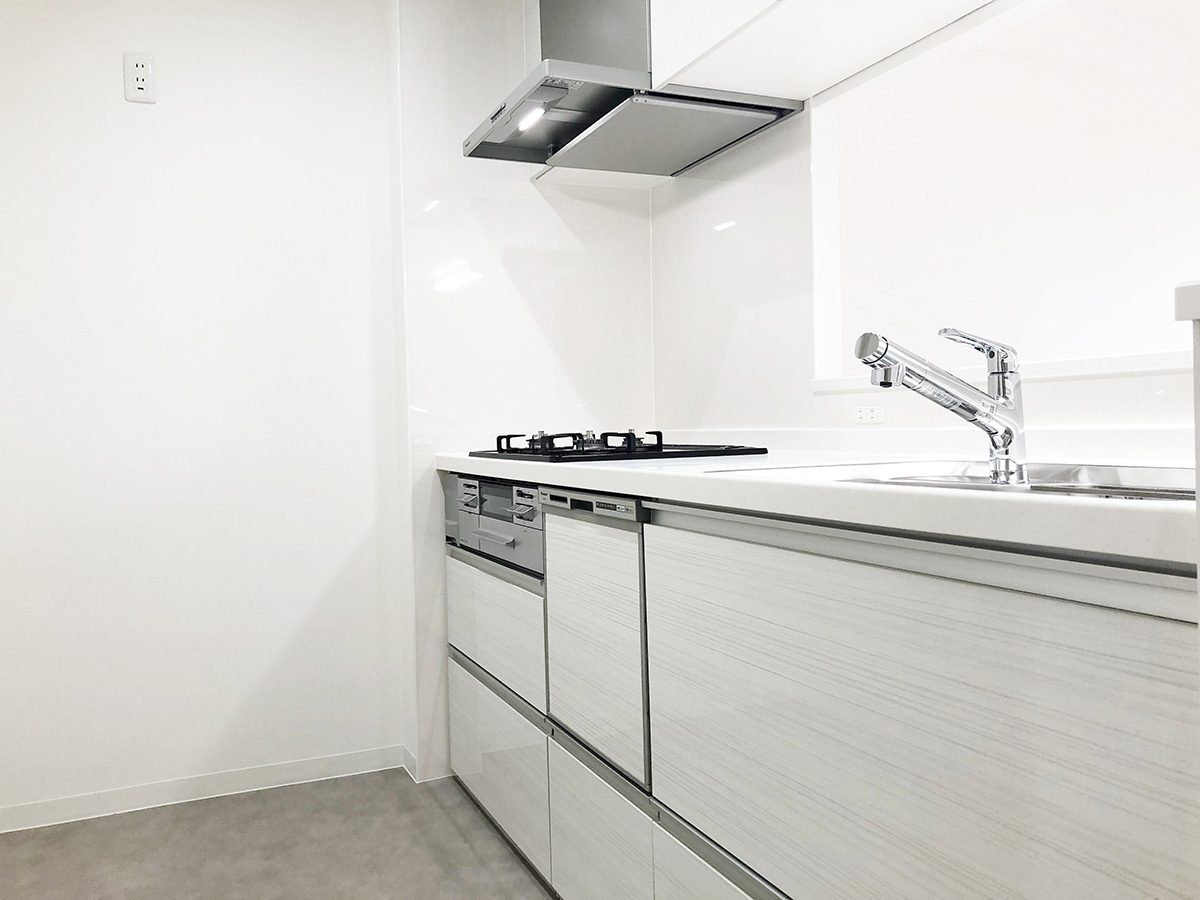 収納のしにくい開き戸から引き出し収納のシステムキッチンにすることで、たくさん収納することができるようになりました。色も白で統一され、スタイリッシュな雰囲気に。全体的に明るくなり、お料理もはかどりますね!