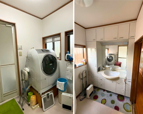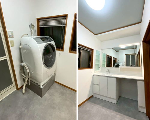 もともとあった洗濯パンは撤去し、給水栓とコンセントを使いやすい位置へ移設しました😊✨また、洗濯機の下にオリジナル台座を造作し、振動対策とお掃除のしやすさを両立🙌✨壁面には埋込収納棚を設け、タオルや洗剤のストックもすっきり収まるようになりました🎵仕上げに、クロスとクッションフロアも張替えて、明るく清潔感のある空間に生まれ変わりました✨