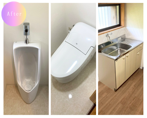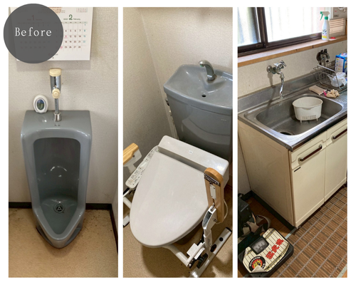 昔ながらのタンク付きトイレで、段差や使いづらさが課題だったトイレ空間は、最新の一体型トイレにリフォーム✨小便器はセンサー付きの機器に取替え、見た目も機能も進化しました💕