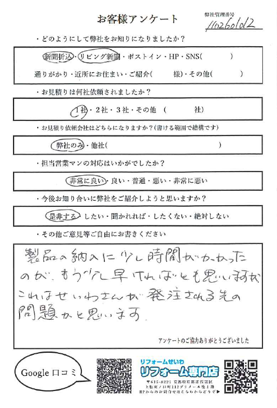製品の納入に少し時間がかかったのが、もう少し早ければとも思いますが、