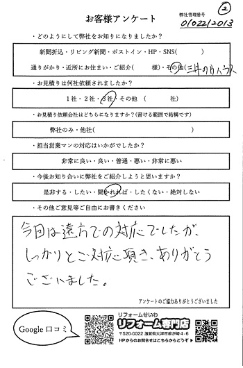 今回は遠方での対応でしたが、しっかりとご対応頂きありがとうございました。