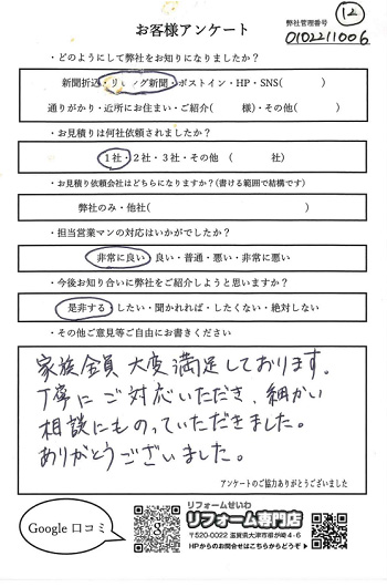 家族全員大変満足しております。丁寧にご対応いただき、細かい相談にものっていただきました。ありがとうございました。