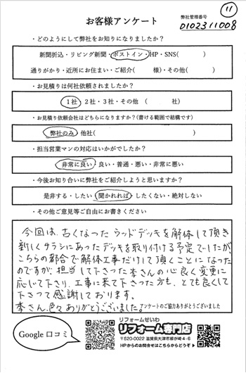 今回は古くなったウッドデッキを解体していただき新しくチラシにあったデッキを取り付ける予定でしたが、こちらの都合で解体工事だけしていただくことになったのですが、担当して下さった李さんが良く変更に応じて下さり、工事に来てくださった方もとても良くしてくださって、感謝しております。李さん、いろいろありがとうございました。