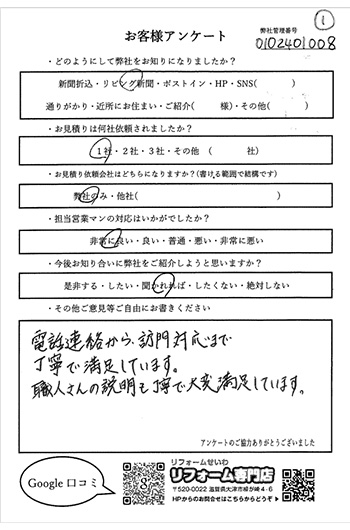 電話連絡から訪問対応まで 丁寧で満足しています。 職人さんの説明も丁寧で大変満足しています