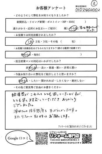 給湯器がこわれてとても困っていたのですが とても早く対応していただき ありがとうございました。 深田さんの接客態度もすばらしかったです またリフォームするときはお願いします