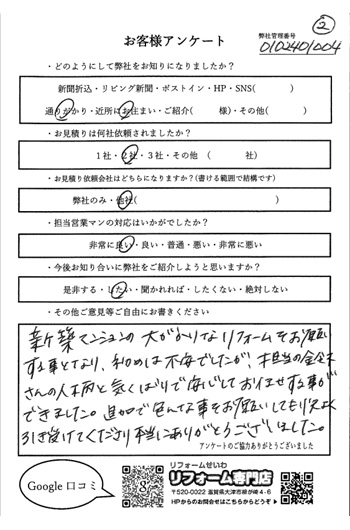 新築マンションの大掛かりなリフォームを お願いする事となり、始めは不安でしたが、 担当の鈴木さんの人柄と気くばりで 安心してお任せする事ができました。 追加で色んなことをお願いしても 快く引き受けて下さり本当にありがとうございました