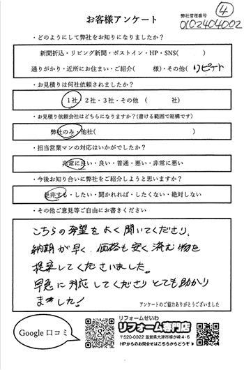 こちらの希望をよく聞いて下さり、納期が早く、 価格も安く済むものを提案してくださいました。 早急に対応してくださりとても助かりました!