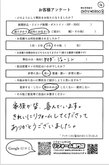 家族が皆、喜んでいます きれいにリフォームしてくださって ありがとうございました