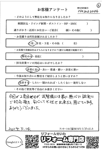 今回が2度目ですが、武智様には常に熱心に誠実に ご対応頂き、安心してお任せ出来たと感じています。 ありがとうございました。