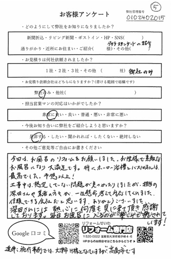 今回はお風呂のリフォームをお願いしました。 お陰様で素敵なお風呂になり大満足です。 特にホーロー浴槽とバスパネルは最高でした。 予想以上! 工事中は想定していない問題が見つかったりしましたが 担当の深田さんや業者の方々が 一生懸命考えて対応してくれました。 信頼できる会社だと思います。 ありがとうございました。 深田さんには熱心に何度も 見に来て頂き感謝しております。 毎日お風呂に入るのが楽しみで癒されています!