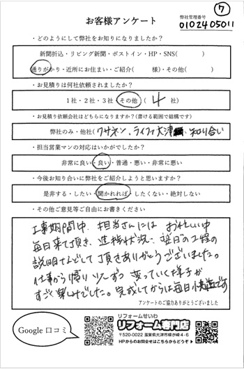 工事期間中、担当さんには お忙しい中毎日来て頂き、 進捗情報、翌日の工程の説明などして頂き ありがとうございました。 仕事から帰り、少しずつ変わっていく様子が すごく楽しみでした。 完成してから毎日快適です。
