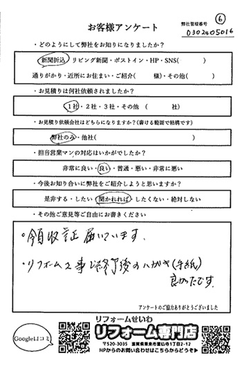 リフォーム工事で終了後のハガキ(手紙)良かったです