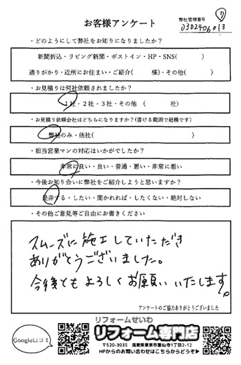 スムーズに施工していただき ありがとうございました。 今後ともよろしくお願いいたします。