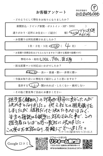 担当者(鎌田氏)の印象が非常に良かったのが 決め手となりました。 他社との相見積もりをしましたが 値段だけで決めたものではなく 当方の相談にも親切に対応された事で この担当者ならばと思い貴社に決めました この度はお世話になり有難うございました。