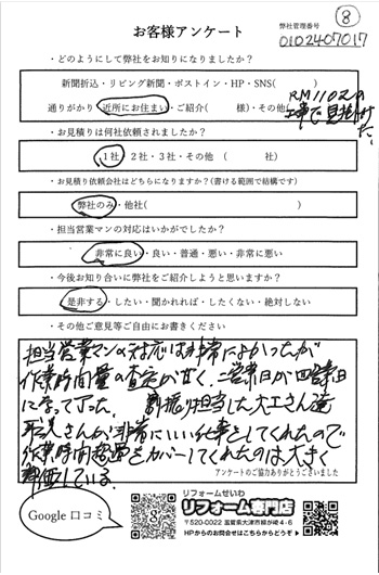 担当営業マンの対応は非常に良かったが 作業時間量の査定が甘く 2営業日が4営業日なってしまった。 割り振り担当した大工さん達職人さんが 非常にいい仕事をしてくれたので 作業時間超過をカバーしてくれたのは 大きく評価している。