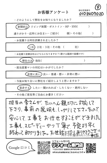 担当の李さんが、たいへん親切に対応してくださり 事前の説明もしっかりして下さったので 安心して工事をお任せすることができました。 工事もスピーディーかつ丁寧で、 予定より早く終わって助かりました。 お世話になりありがとうございました。