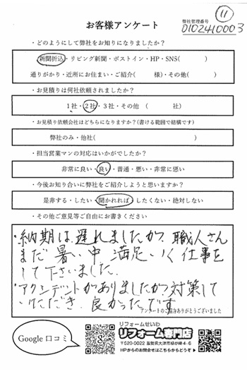 納期は遅れましたが職人さんがまだ暑い中 満足いく仕事をして下さいました。 アクシデントがありましたが、 対策していただき良かったです。