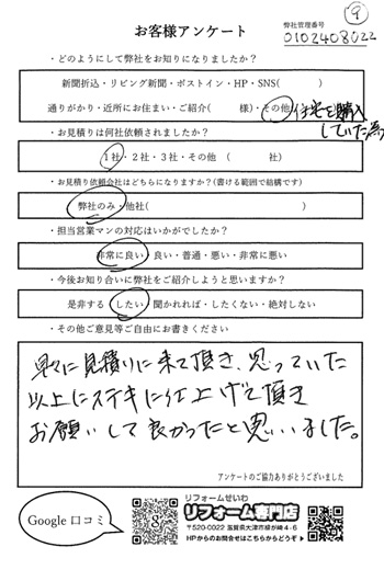 早々に見積もりに来ていただき 思っていた以上にステキに仕上げて頂き お願いして良かったと思いました