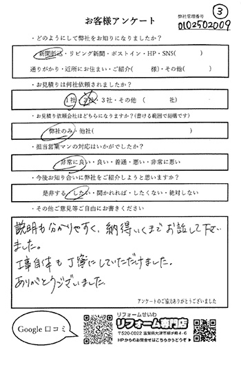 説明も分かりやすく、納得いくまでお話してくださりました。 工事自体も丁寧にしていただけました。 ありがとうございました。