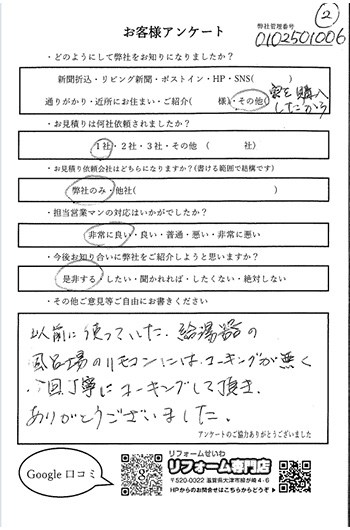 以前に使っていた、給湯器の風呂場のリモコンには、コーキングが悪く 今回、丁寧にコーキングして頂き、ありがとうございました。