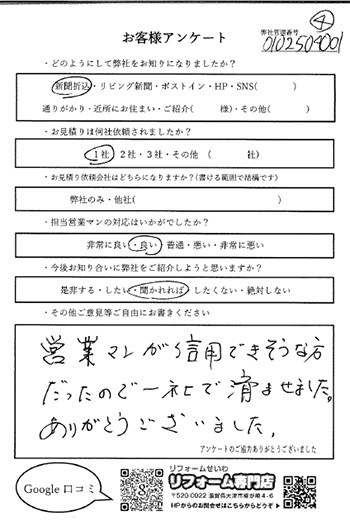 営業マンが信用できそうな方だったので一社で済ませました。 ありがとうございました。