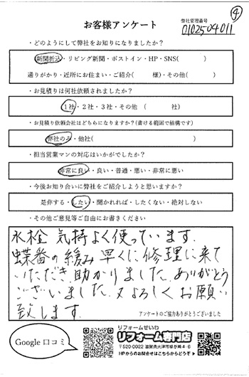 水栓 気持ちよく使っています。 蝶番の緩み早くに修理に来ていただき、助かりました。 ありがとうございました。 又、よろしくお願い致します。