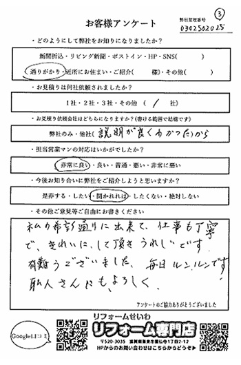私の希望通りに出来て、仕事も丁寧で きれいにして頂きうれしいです。 有難うございました。毎日ルンルンです。 職人さんにもよろしく。
