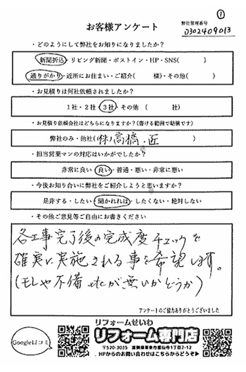 各工事完了後の完成度チェックを 確実に実施される事を希望します。 (モレや不備etcが無いかどうか)