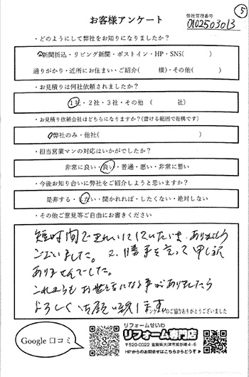短時間できれいにしていただき ありがとうございました。 又、勝手を言って申し訳ありませんでした。 これからもお世話になることがありましたら よろしくお願いいたします。