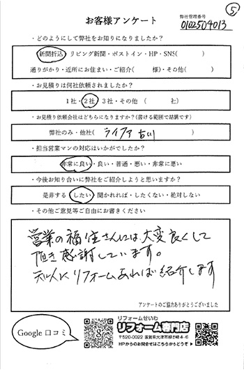営業の福住さんには大変良くして頂き 感謝しています。 知人にリフォームあれば紹介します